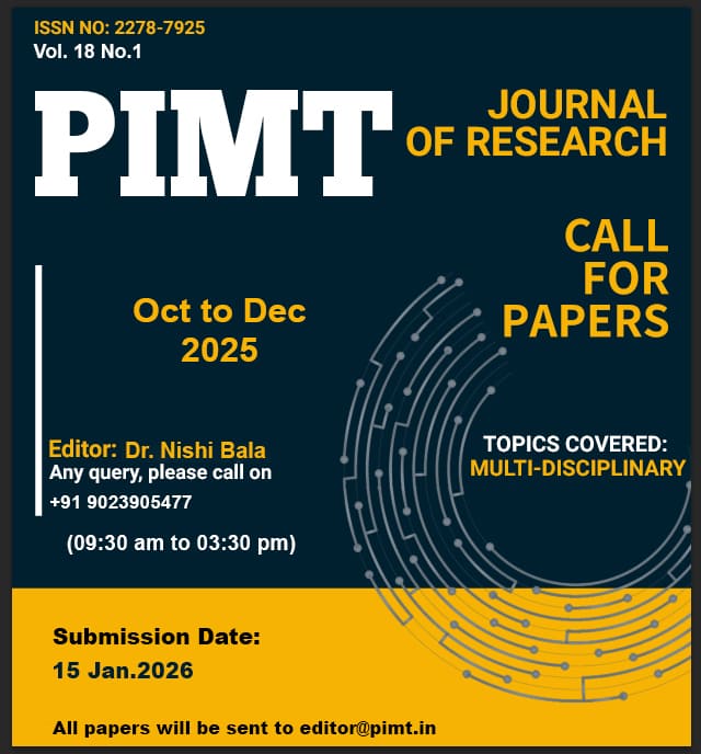 Punjab Institute of Management & Technology focuses on continuous development through research activities. PIMT Journal OF Research (PIMT JR), a peer reviewed refereed journal, started in March, 2008 is the half yearly publication of the Punjab Institute of Management and Technology, Khanna. PIMT-JR carries ISSN No. 2278-7925 which is bi-annual journal. PIMT Journal OF Research (PIMT JR) is International in scope and readership, the journal is multidisciplinary in nature, focusing on pure empirical, applied and interdisciplinary research in different areas, publishing articles on all important aspects from empirical studies and theoretical developments to practical applications in the areas of management, IT, Commerce, airlines, tourism, hospitality and agriculture. The main aim of the journal is to disseminate knowledge and information in all the above mentioned functional areas. The journal is intended to provide forum for debate and deliberation for academics, policy planners, research student of various research areas. All papers are refereed through a double blind process. The journal welcomes the submission of manuscripts that meet the criteria of management, computer science and all other valued areas of excellence. In all the above areas, the PIMT Journal publishes a summary of the study, bibliography, research papers, articles, book reviews and doctoral dissertation.